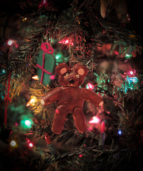 I love the things that connect me to past Christmases. I have so many love crafted ornaments on our tree. Ornaments that take me back years & to the memories of the little one that created them. My son Shad made this for me when he was 6 years old. I'll never forget him flying to our car after school, clutching a little wrapped gift in his hands for me, & begging me to open it "right now". I treasure this little bear, & I treasure turning it over & seeing his little boy fingerprints on the back of the dough.